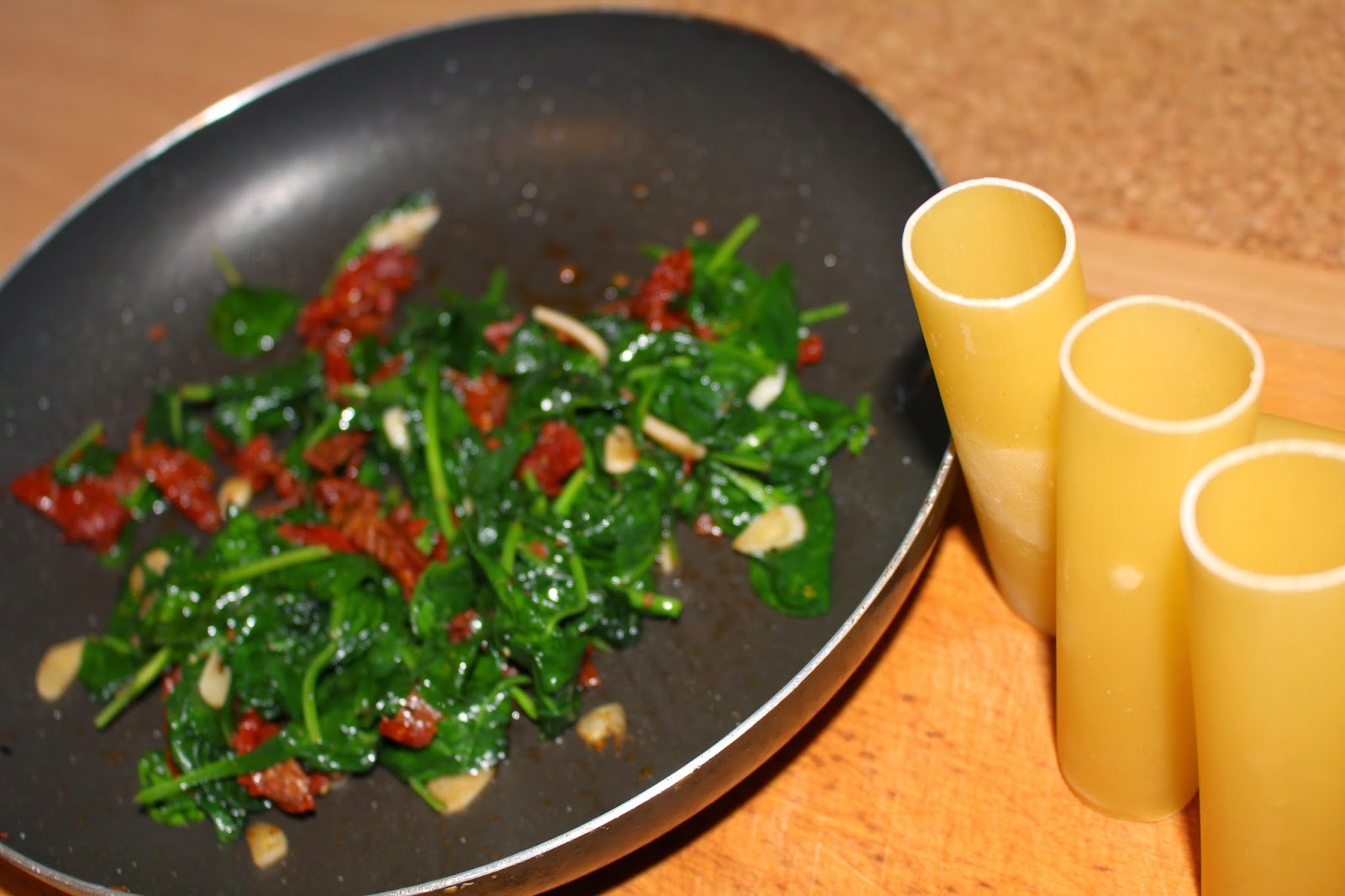 Na oliwę z oliwek dodałam pokrojone w plastry ząbku czosnku, delikatnie je poddusiłam następnie dodałam pokrojone w paski suszone pomidory a na sam koniec szpinak, doprawiłam pieprzem i solą do smaku. Kilka minut dusiłam na patelni, tak aby wszystkie składniki się połączyły.