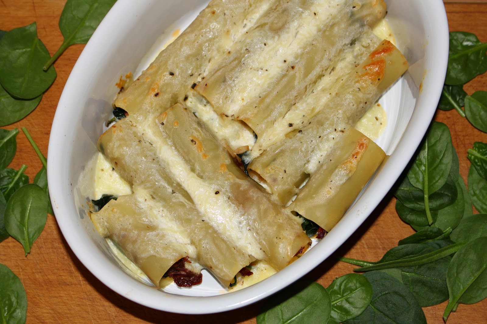 Na gotującą się wodę wrzuciłam makaron cannelloni – ugotowałam al dente. Następnie tak przygotowany makaron wypełniłam farszem. Ułożyłam każdą z rurek w żaroodpornym naczyniu, polałam sosem z jogurtu naturalnego i sera mozzarella i zapiekałam przez kilka minut.