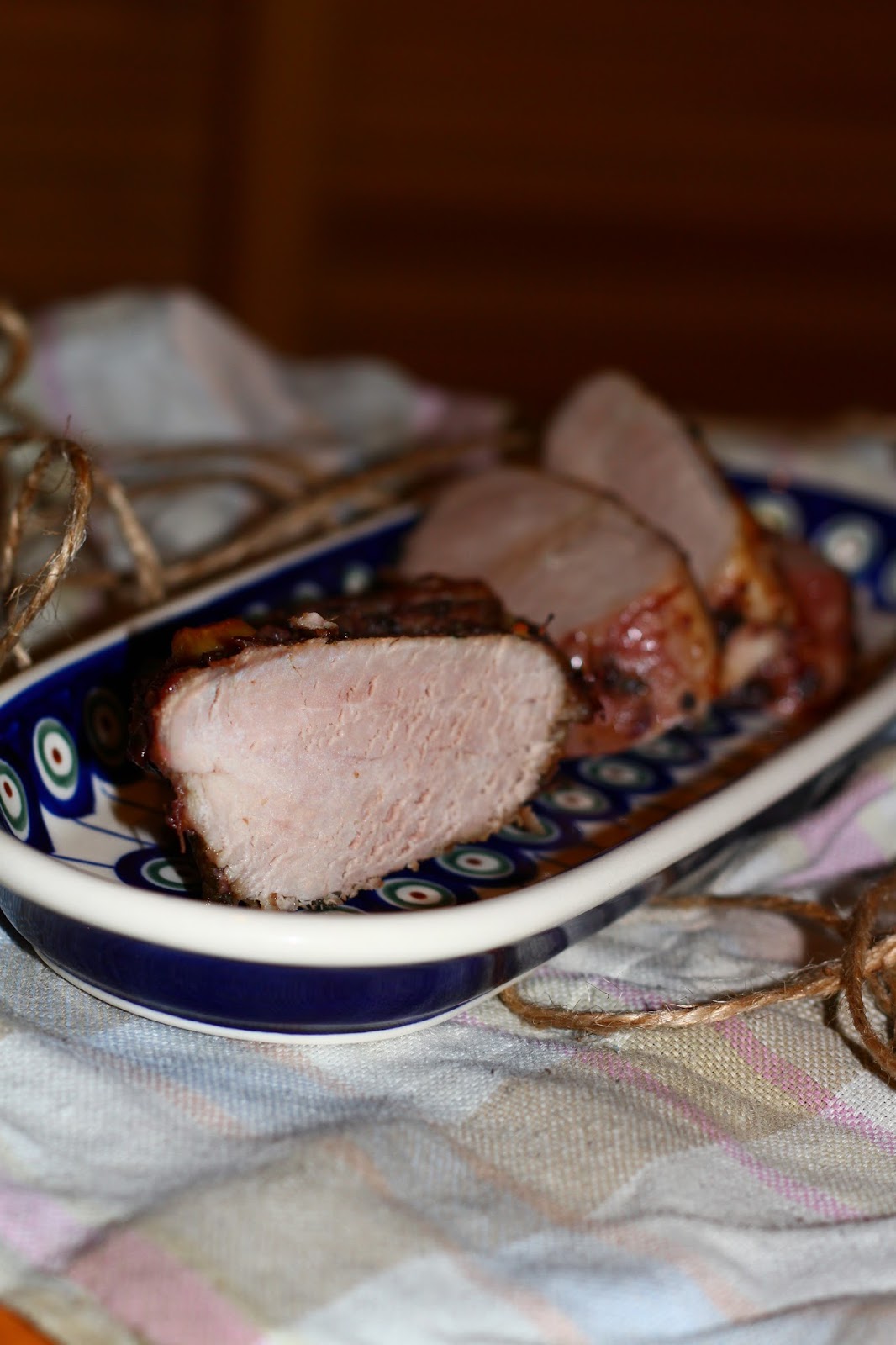 Polędwiczkę opłukałam i wysuszyłam ręcznikiem papierowym potem oprószyłam solą i świeżo zmielonym pieprzem, dodałam drobno pokrojony lubczyk oraz czosnek. Następnie zajęłam się przygotowaniem marynaty. Do jej przygotowania użyłam łyżki miodu, octu balsamicznego, soku z połowy cytryny, 3 łyżek zmielonej żurawiny oraz oliwy. Polędwicę zamarynowałam i odstawiłam na noc do lodówki. Przełożyłam do naczynia żaroodpornego i piekłam 40 minut w 180 C.