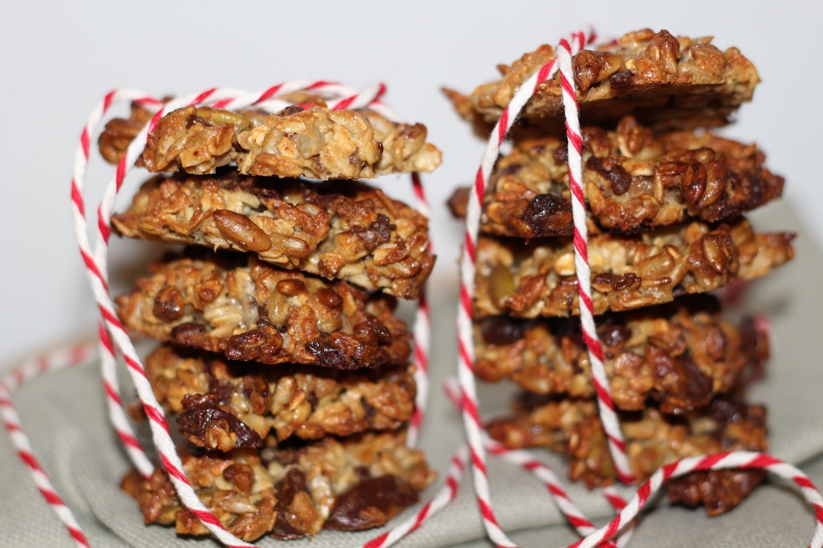 SPOSÓB PRZYGOTOWANIA: W dużej misce wymieszać wszystkie produkty sypkie tj. mąkę, płatki owsiane, pestki dyni, ziarna słonecznika, orzechy włoskie oraz tabliczkę czekolady drobno pokruszoną oraz dodać szczyptę soli. Pozostałe składniki tj. miękkie masło, 2 jajka, cukier trzcinowy oraz miód zmiksować na jednolitę masę. Na koniec wszystkie składniki łączymy, układamy na blasze, i pieczemy w temperaturze 190 C, ok 15-20 minut.