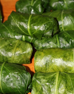 Przygotowanie: Z liści usuwam zgrubienia, wkładam do garnka z wrzątkiem i trzymam co najmniej 3 minuty. W międzyczasie przygotowuję farsz do gołąbków. Ryż gotuję tak, aby był al dente, pozostawiam do ostudzenia. Grzyby gotuję przez około 20 minut, studzę a następnie drobno kroję. Na maśle duszę drobno posiekaną cebulę. Wszystkie składniki dokładnie mieszam i przyprawiam solą, świeżo zmielonym pieprzem oraz ostrą papryką. Na każdy liść nakładam porcję farszu i zwijam dość ciasno. Zawijam brzegi liścia do środka (tu może pojawić się pewna trudność bo liście kalarepki nie są zbyt duże) i układam w garnku jeden obok drugiego. Zalewam całość wywarem i gotuję nie mniej niż 30 minut.