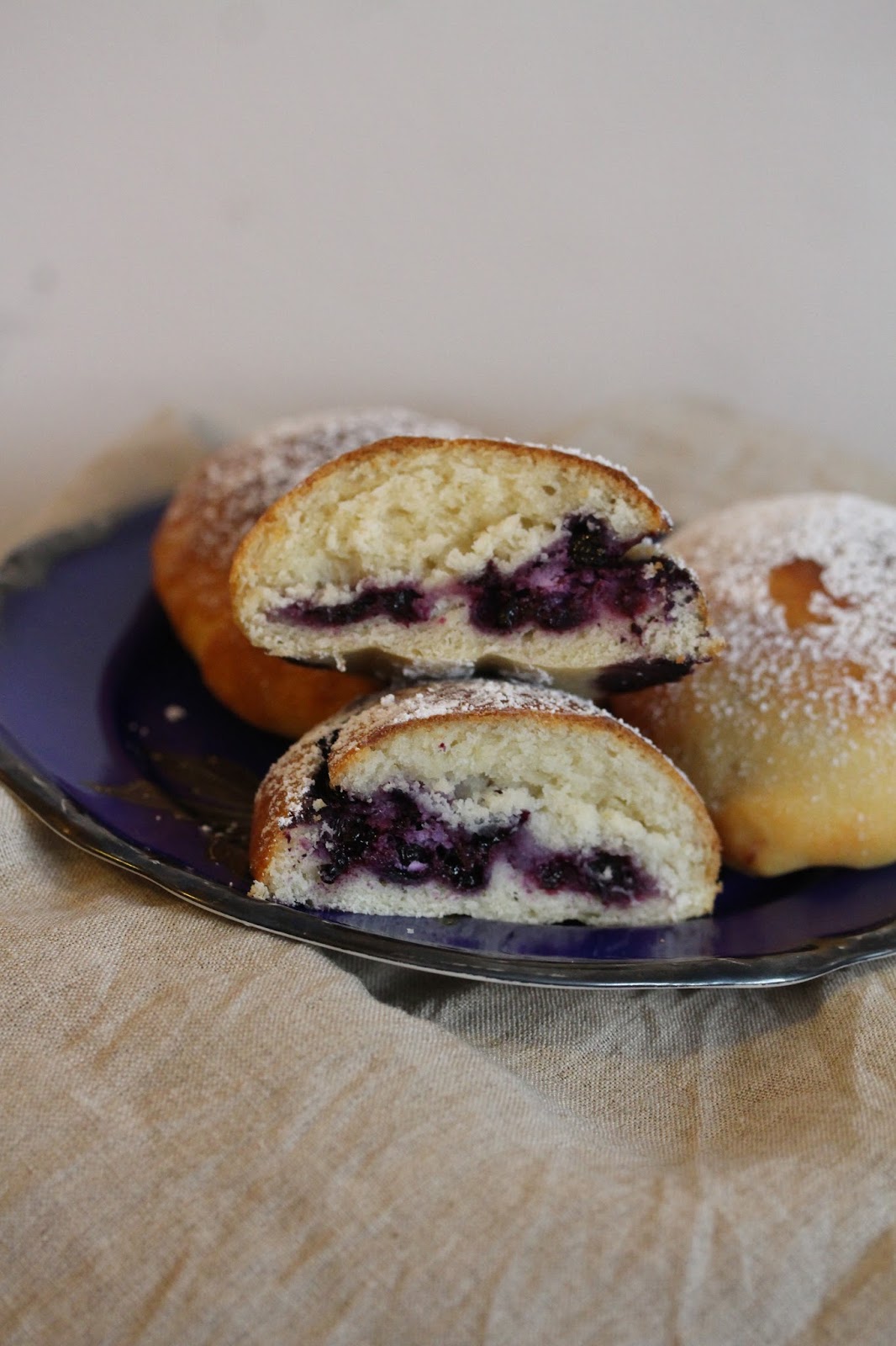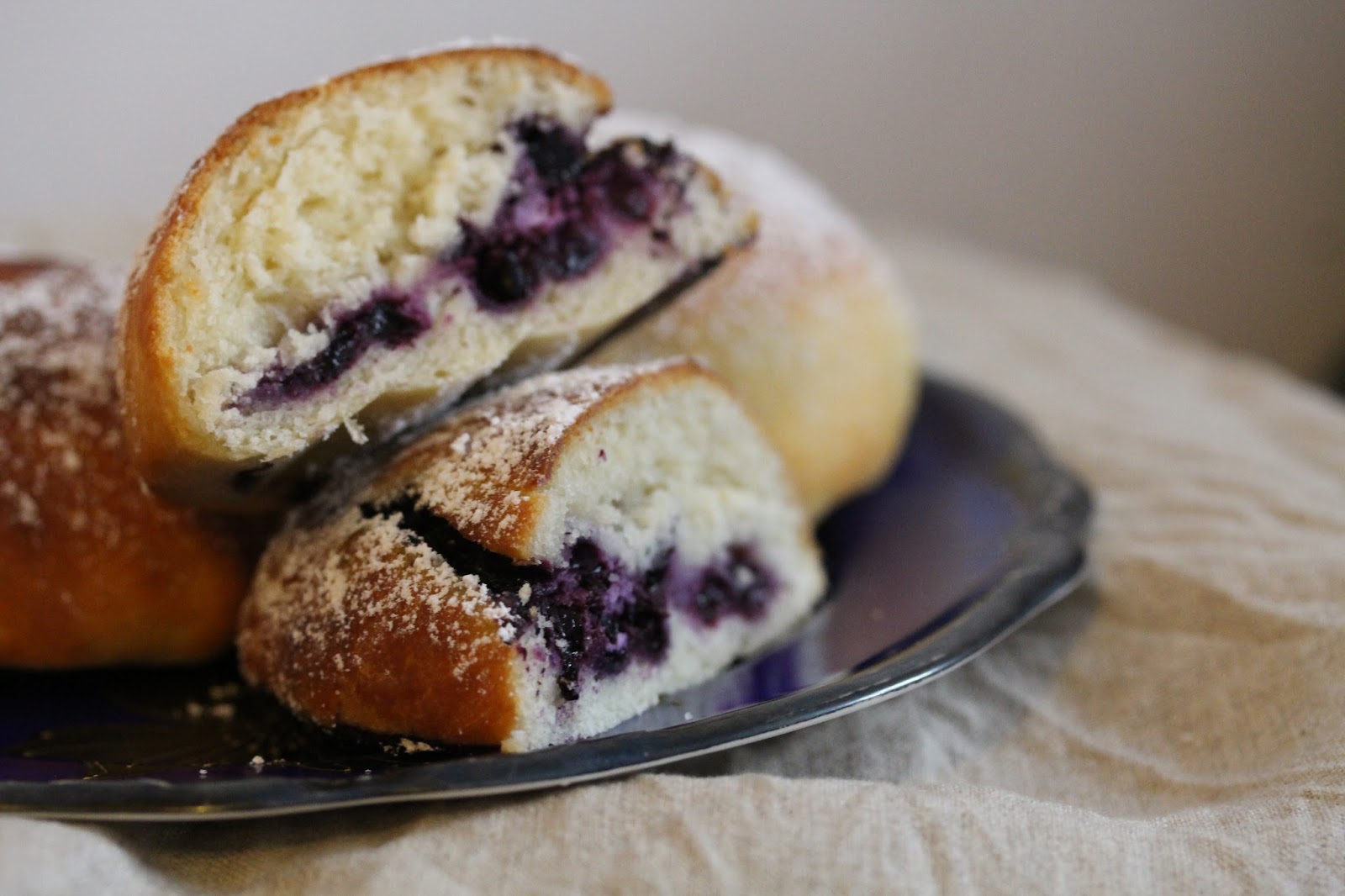 W międzyczasie przygotowujemy farsz: oczyszczone jagody łączymy z twarogiem i cukrem lub miodem. W oddzielnej misce przesiewamy pozostałą mąkę, dodajemy cukier i jajka. Wyrośnięty zaczyn dodajemy do powyższych składników jednocześnie mieszając. Następnie dokładamy rozpuszczone i ostudzone masło i wyrabiamy ciasto (ręką lubą za pomocą miksera). Po kilku minutach wyrabiania ciasta dolewamy cienkim strumieniem olej i ponownie ugniatamy ciasto (nie powinno kleić się do rąk).Gotowe ciasto przykrywamy lnianą ścierką i odstawiamy na 1,5 godziny w ciepłe miejsce. Wyrośnięte ciasto ponownie zagniatamy i dzielmy na części (ok. 10), spłaszczamy i umieszczamy na niej gotowy farsz. Formujemy bułeczki i układamy na blaszce wyłożonej papierem do pieczenia. Pieczemy w rozgrzanym piekarniku w 200 stopniach C przez ok. 20 minut (w zależności od piekarnika).