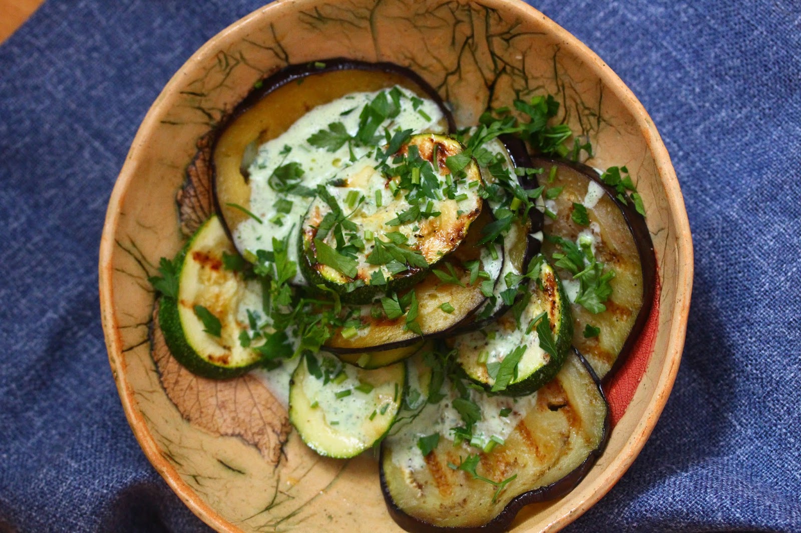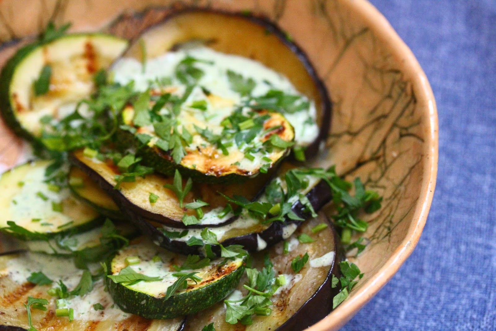 Na talerzu układamy cukinię i bakłażana, polewamy sosem i posypujemy drobno posiekaną natką pietruszki.