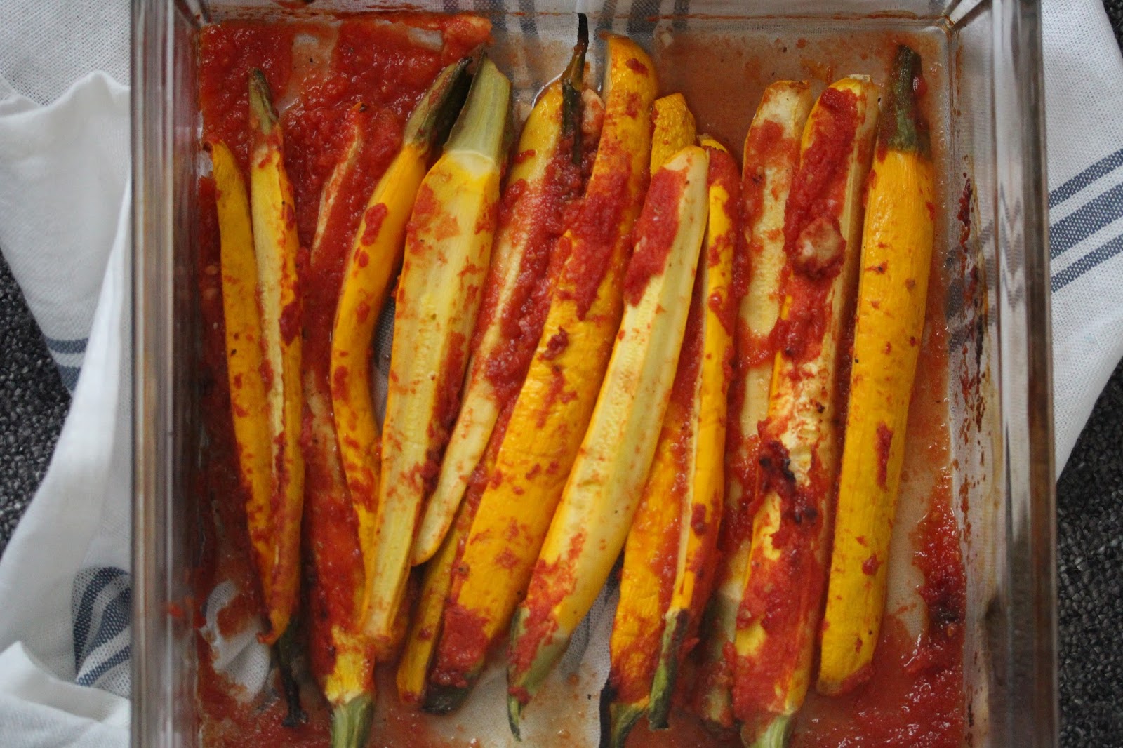 Jak to u mnie bywa pomysł pojawił się w chwili otwarcia lodówki. I takim sposobem narodziła się idea przygotowania cukinii zapiekanej w sosie pomidorowym. Zwyczajem na moim blogu stało się, że podaje trochę informacji na temat wartości odżywczych produktów z których korzystam. Przejdźmy do konkretów! Cukinia przywędrowała z Włoch, a po włosku „zucchina” to mała dynia. W zależności od odmiany może być ciemnozielona, żółta lub pasiasta.