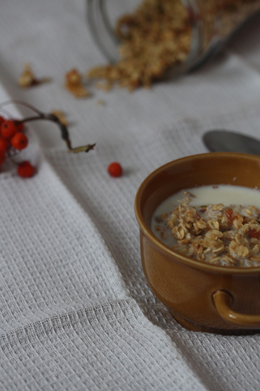 Zastanawialiście się kiedyś co to właściwie jest ta granola? Pomyślałam, że wyjaśnię znaczenie tego określenia. Mianowicie granola, słowo angielskie, pochodzące od włoskiego zdrobnienia grano czyli zboże, pszenica. W kuchni możemy określić, że jest to mieszanina płatków zbożowych, rodzynek, orzechów, suszonych owoców i cukru (miodu), pieczona do chrupkości.