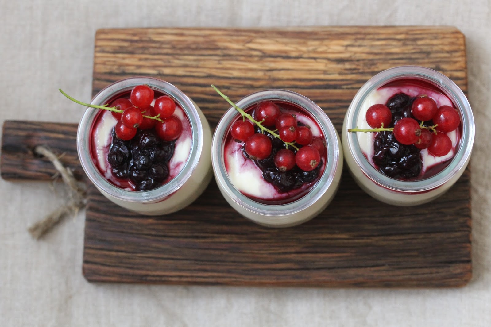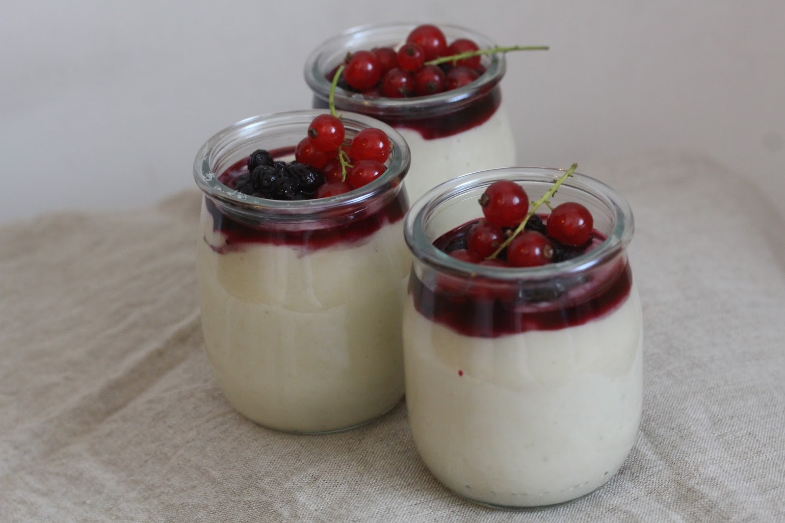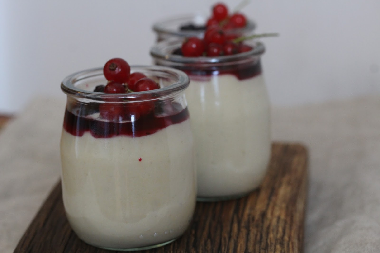 Przygotowanie: Kaszę jaglaną przepłukuję na sicie pod strumieniem ciepłej wody. Wsypuję do rondelka, wlewam szklankę mleka i dotuję na minimalnym ogniu pod przykryciem ok. 15 minut aż kasza wchłonie cały płyn. Ostudzoną kaszę przekładam do pojemnika blendera, dodaję obranego banana, miód oraz drugą szklankę mleka. Całość dokładnie miksuję, aż powstanie gładki budyń. Wykładam do naczyń (tym razem użyłam słoiczków – ładnie prezentuję się na zdjęciach :-)), dodałam owoce: jagody i czerwone porzeczki. Deser gotowy!