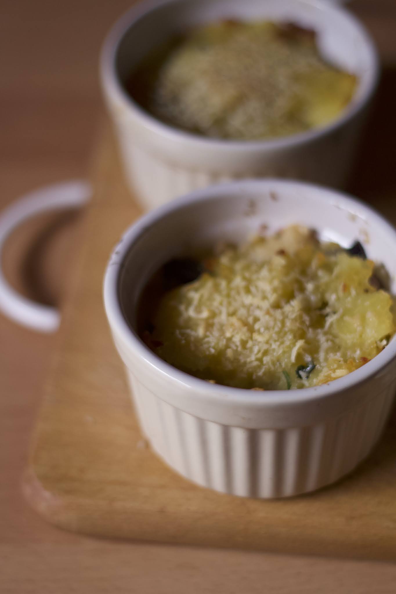Z ziemniaków robię puree dodając mleko oraz masło, doprawiam solą, pieprzem i gałką muszkatołową (dosłownie szczypta). Masa ziemniaczana powinna być delikatna i aksamitna. A żeby tak się stało należy zdecydowanym ruchem przez kilka minut ucierać tłuczkiem ziemniaki. Co dalej – na rozgrzanej oliwie przesmażam ćwiartki pieczarek, do tego dokładam pokrojony w kostkę bakłażan, kilka minut duszę, doprawiam solą i świeżo zmielonym pieprzem. Na sam koniec dodaję drobno posiekaną natkę pietruszki. Tak przygotowane składniki przekładam do kokilek, zaczynając od pieczarek i bakłażana, na to puree, na wierzch ścieram na tarce parmezan i wstawiam do piekarnika na ok. 30 minut. Po wyjęciu, należy formy ostudzić i można jeść.